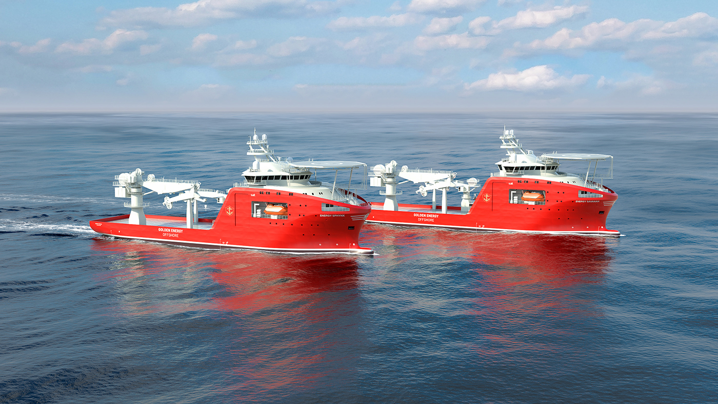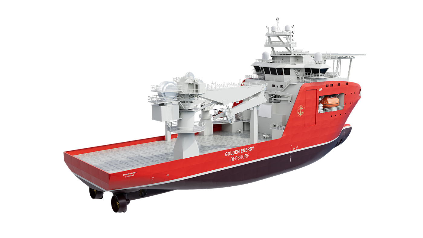 Golden Energy Offshores 305 RSV series are state of the art vessels with high capacities and good station keeping capabilities. The hull form design and the diesel electric propulsion system, ensures exceptional performances with regards to fuel consumption, sea keeping, station keeping, speed, and stability. Low fuel consumption with low emissions and a ballast treatment plant makes the vessels environmental friendly. The propulsion system comprises two azimuth type propellers, each driven by an electrical motor. Two tunnel thrusters and one azimuth are installed in the fore part of the Vessel. The compliance with IMO Resolution MSC.266(84) Code of safety for special purpose ships will allow the vessel to have more charterers personnel onboard if required. A ROV hangar is included in the vessel design, to allow for operation of 2 x WROV systems in sheltered conditions. 2 x Integrated AHC LARS systems has been installed to ensure safe effective operation of the ROVs. 3 split hangar doors on each side and a roller gate on the aft side of the hangar, provide the required access to the hangar. The 150T AHC Offshore Crane located on SB side has access to approx. 80 % of Main Deck @ 75T SWL, and almost the entire deck @ 50T SWL. A helideck certified for Sikorsky S-92 Helicopter has been installed to improve logistic possibilities of personnel and spare parts.